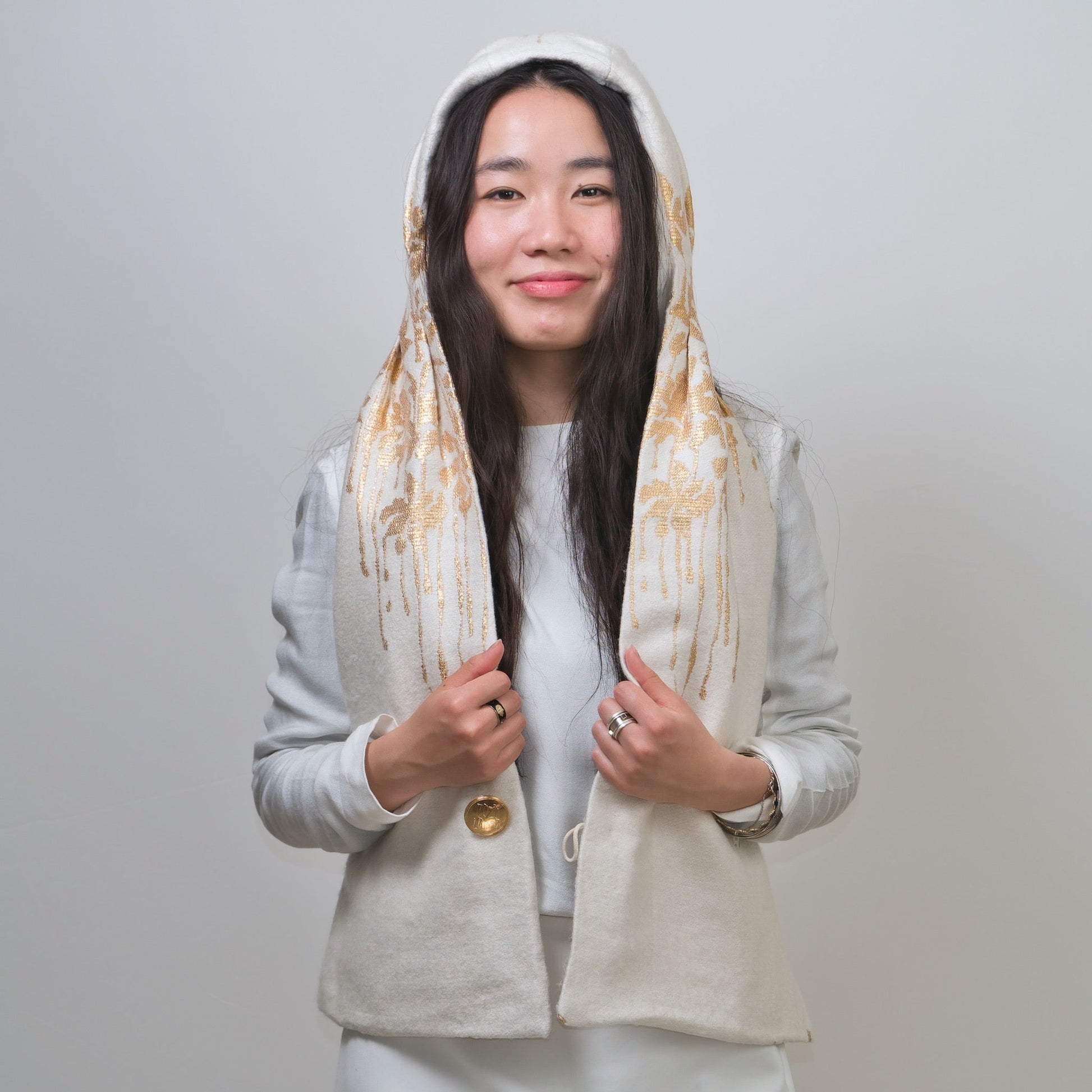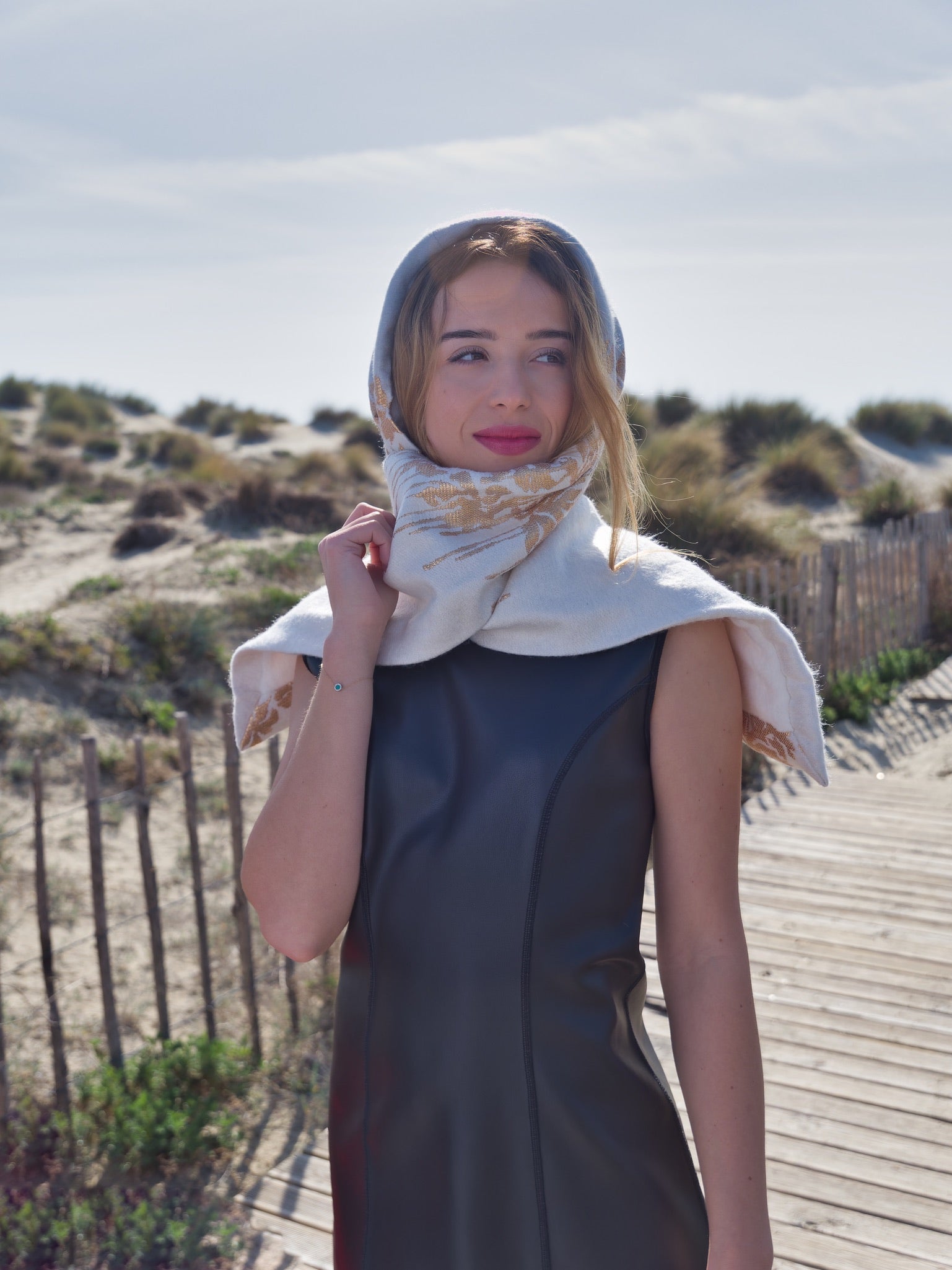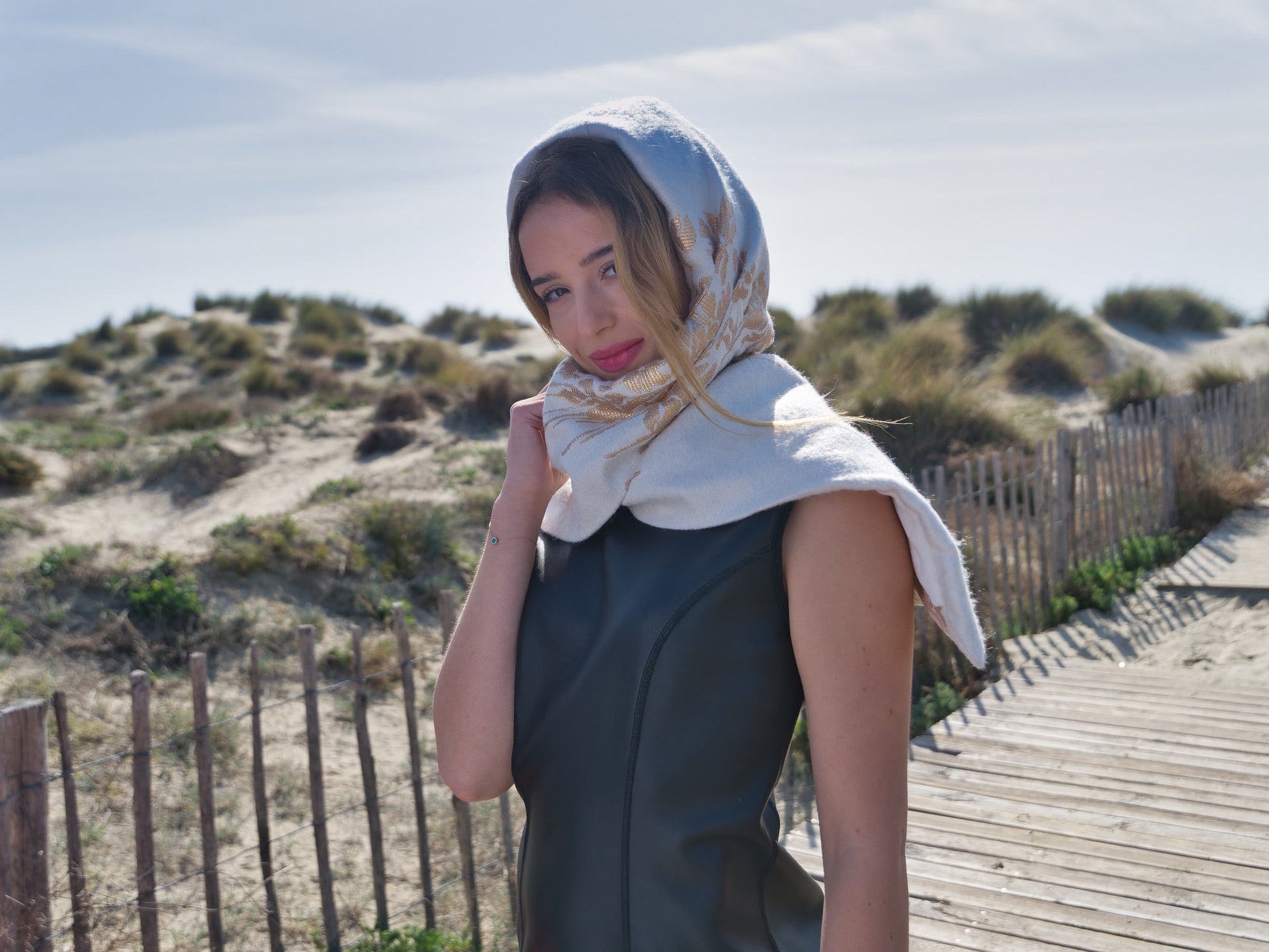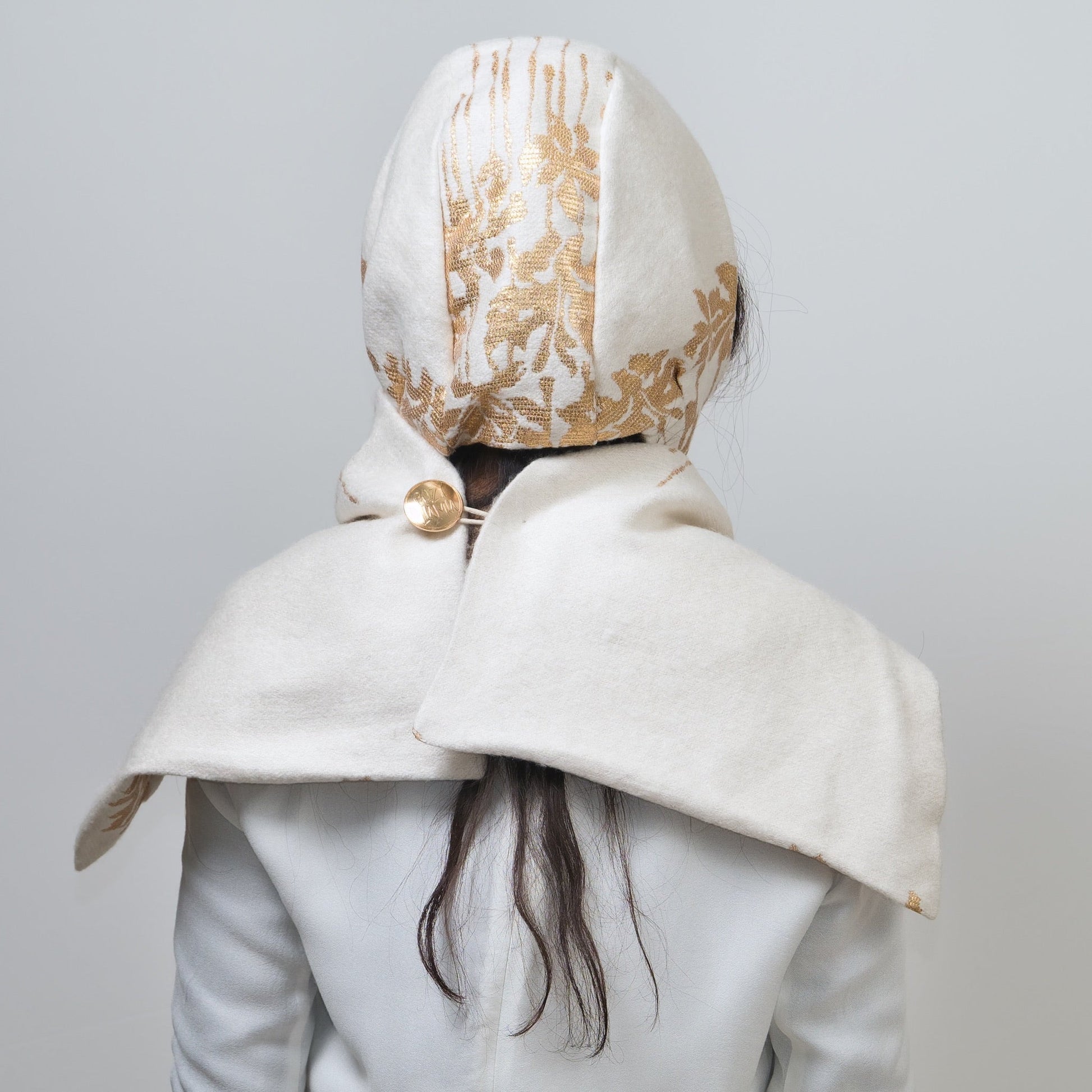 The "Winter Princess" hooded scarf is made with a high-fashion fabric from the French Maison "Malhia Kent". It is pleated on both sides. Shiny golden metallic threads present a poetic leaf motif.