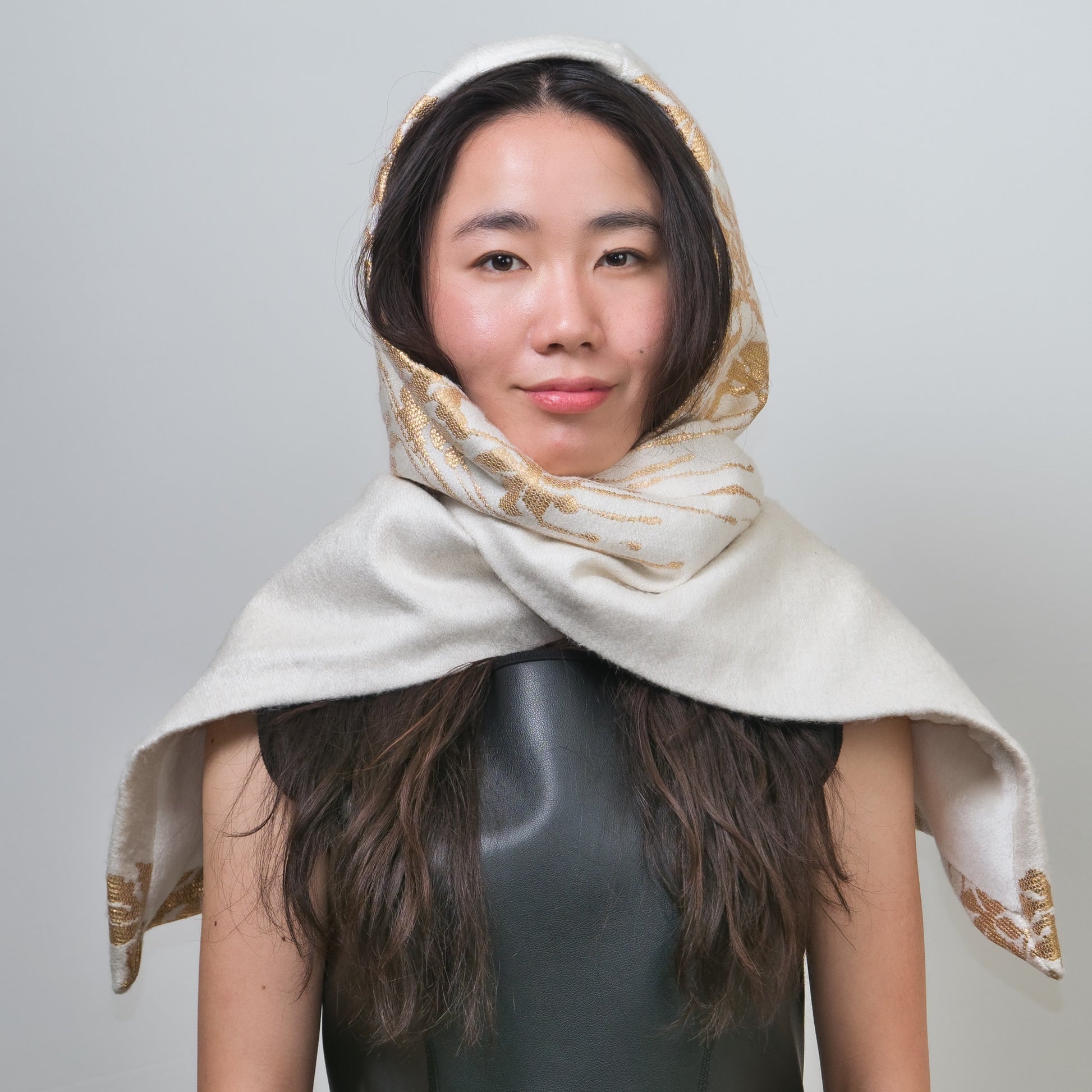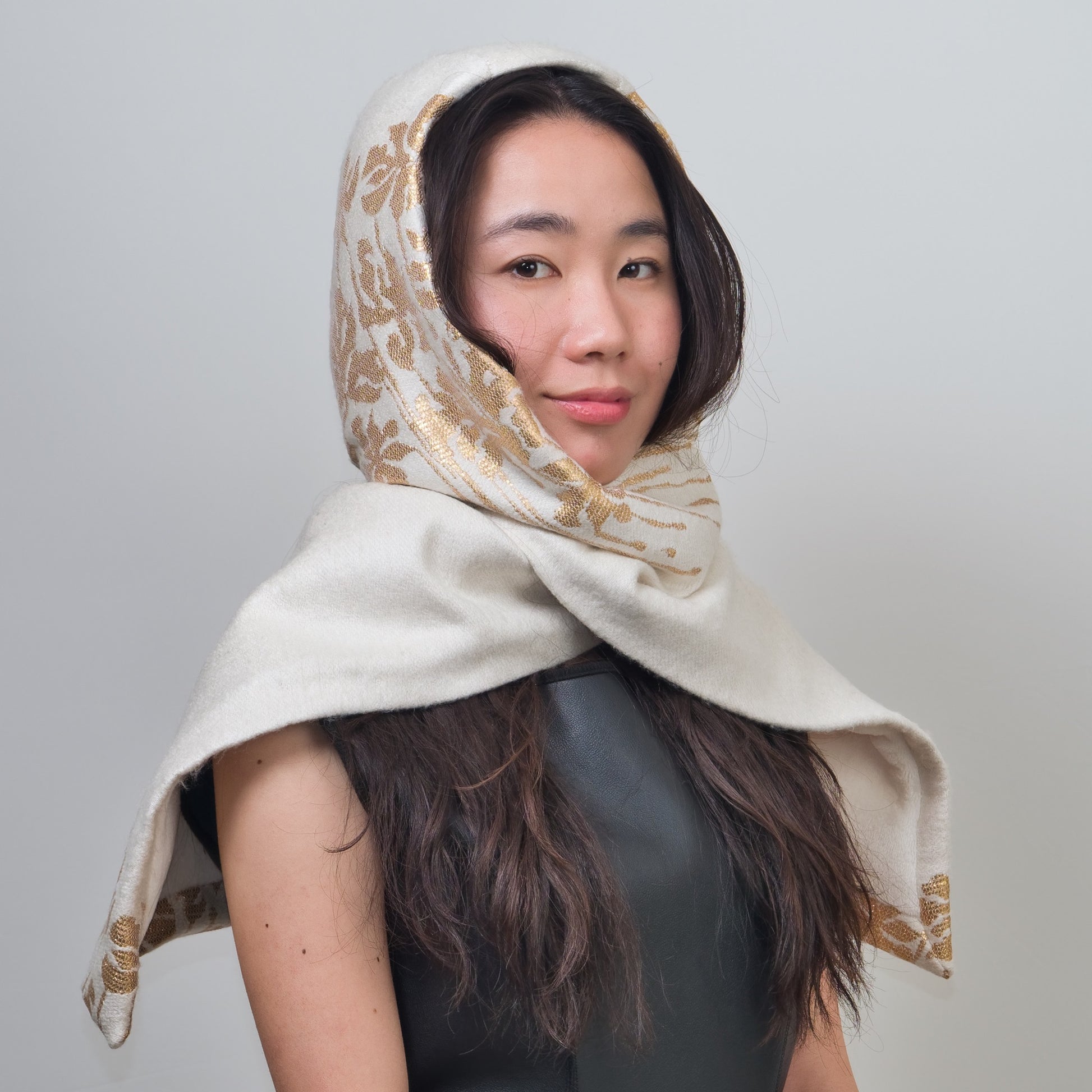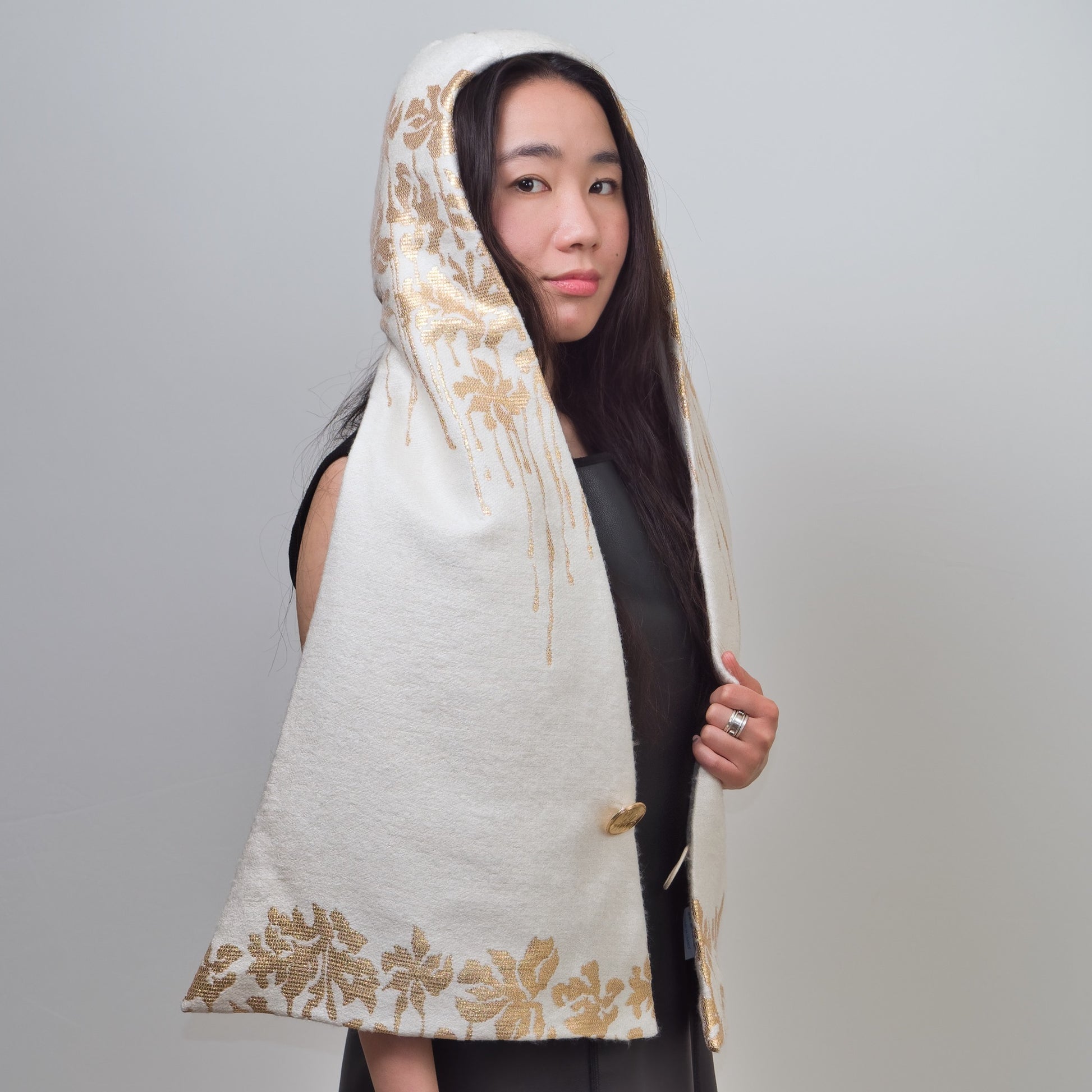 The "Winter Princess" hooded scarf is made with a high-fashion fabric from the French Maison "Malhia Kent". Shiny golden metallic threads present a poetic leaf motif.
