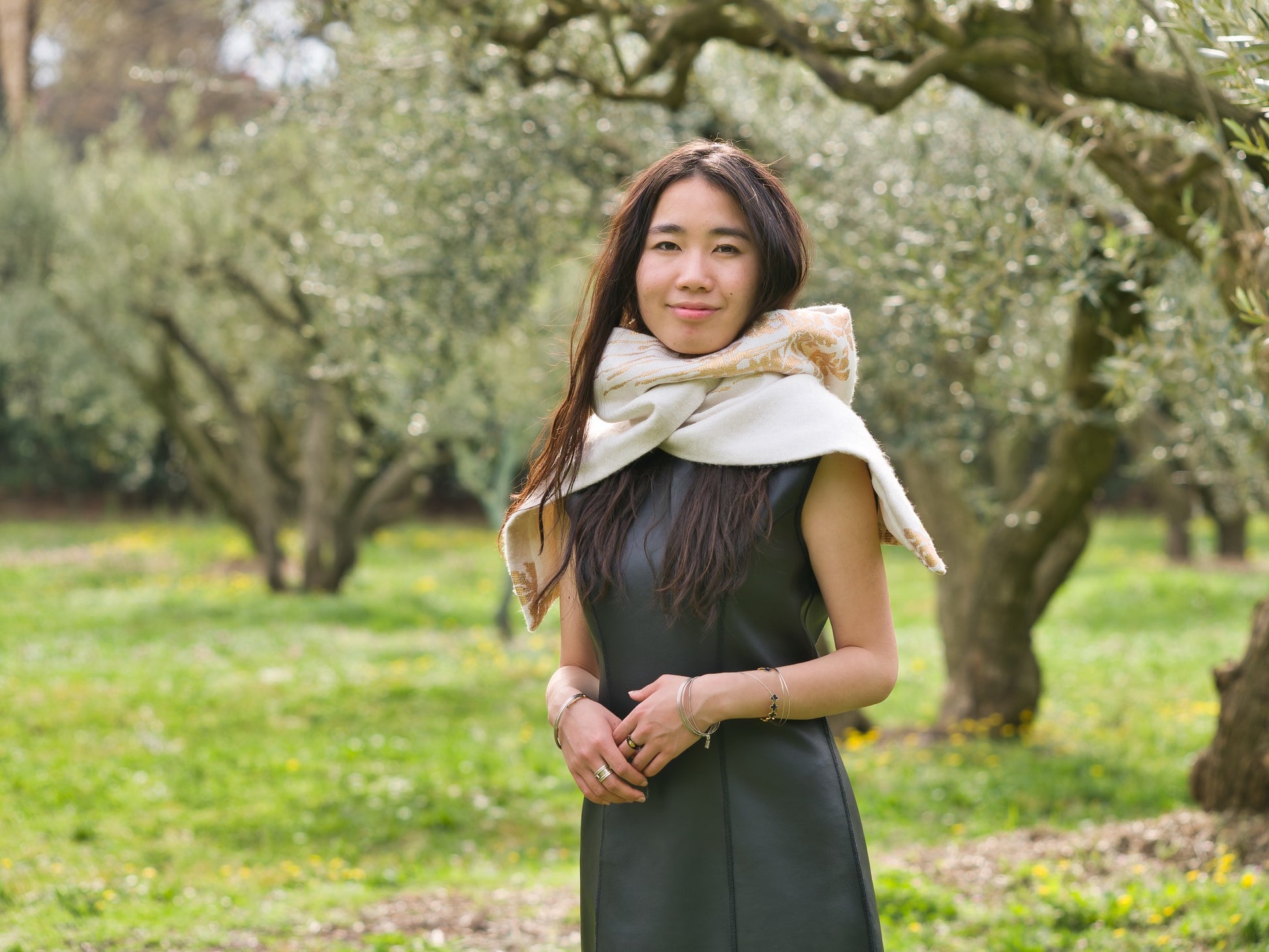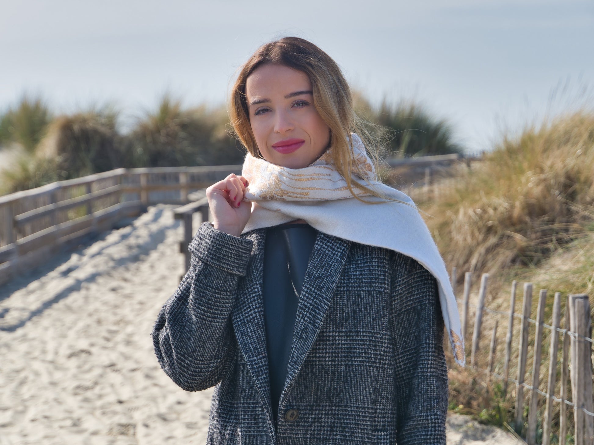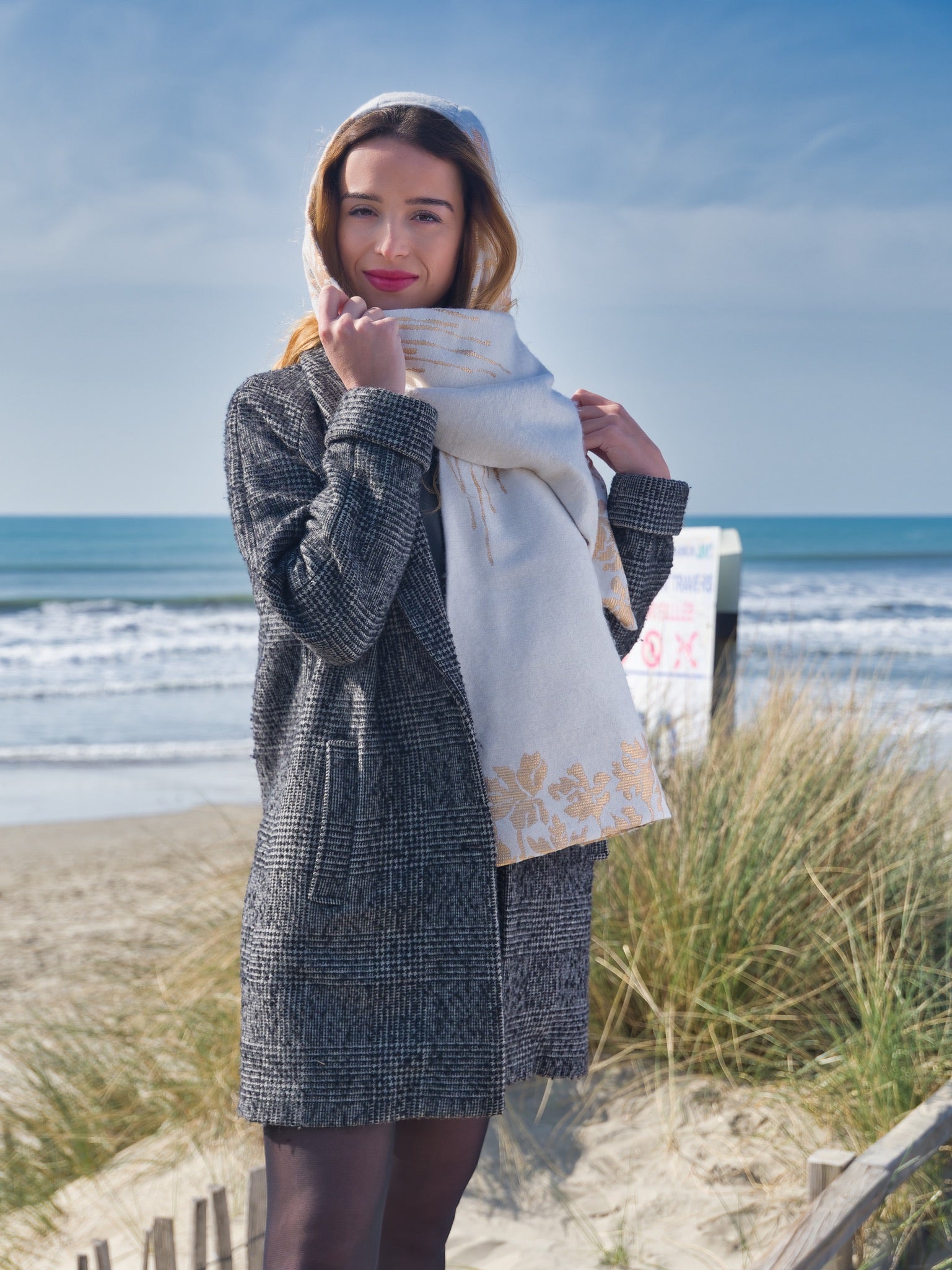 The "Winter Princess" hooded scarf is made with a high-fashion fabric from the French Maison "Malhia Kent". Shiny golden metallic threads present a poetic leaf motif.