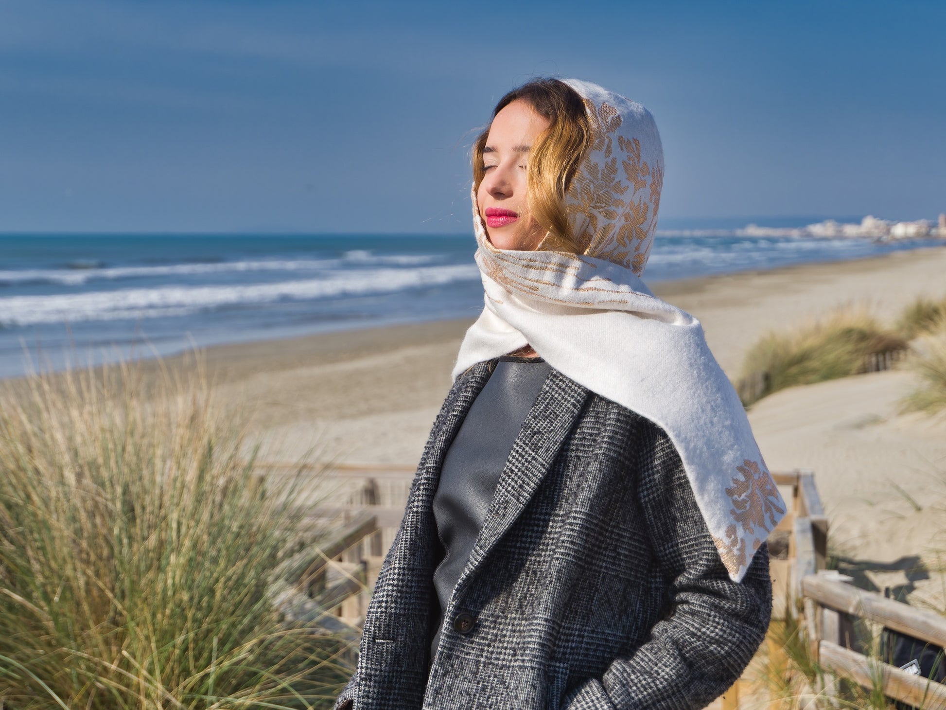 Enjoy cocooning into this elegant head and neck covering and keep warm in the outdoor chill while looking glamorous.